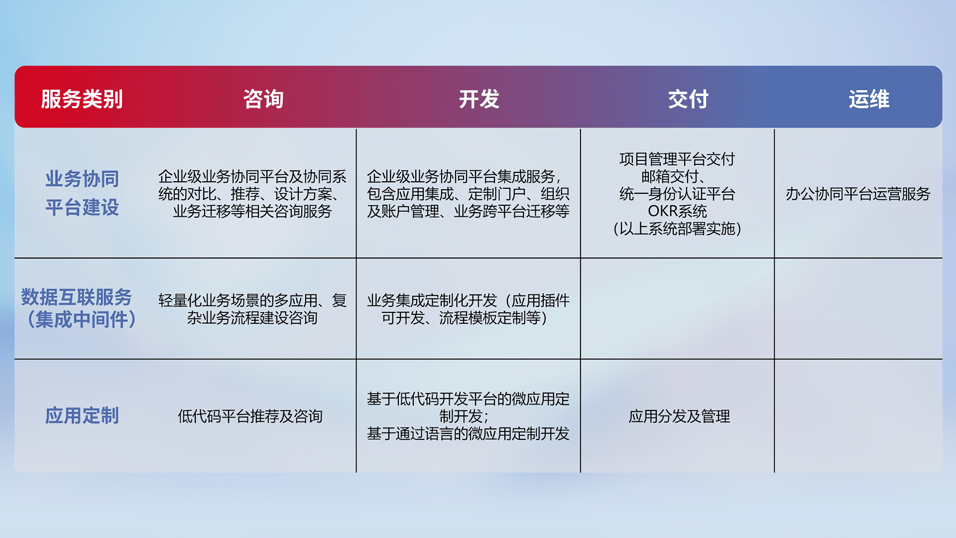 针对钉钉、、、、企微、、IDaas等平台级产品提供产品的规划、、、、方案、、、、交付、、定制化开发等服务,,实现如统一协同办公、、、智能客户服务、、、混合会议管理、、智能数据查询、、、等业务场景,,,实现数字化转型。。。。